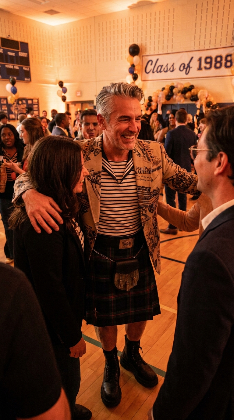 Kombinacija prugaste majice, upečatljivog sakoa i tradicionalnog kilta predstavlja smeli modni izbor za one koji vole da eksperimentišu sa stilom. Ovaj izgled slavi individualnost, kreativnost i slobodu izražavanja, uz dozu šarma i razigranosti. Inspirisan estetikom Jean Paul Gaultier, ovaj outfit pokazuje da moda može biti i zabavna i autentična.